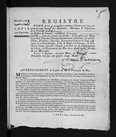 Collection du greffe. Baptêmes, mariages, sépultures, 1789