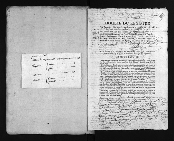 Collection du greffe. Baptêmes, mariages, sépultures, 1775