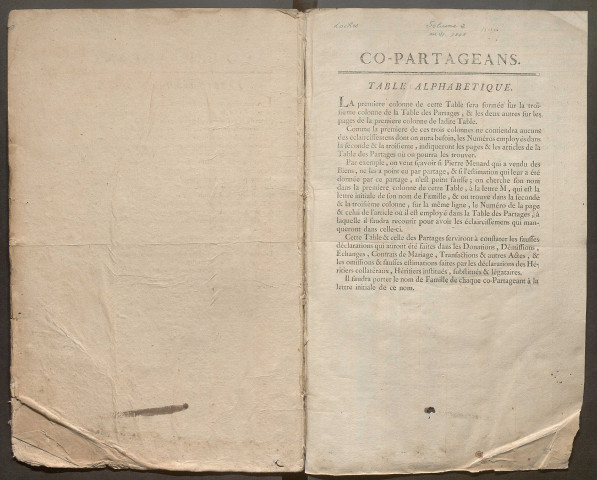 En principe, les tables de renvoi indiquent, en face de chaque inscription, le numéro de volume auquel il faut se reporter ainsi que le folio, mais il n'en est pas toujours ainsi et, nous l'avons vu plus haut, l'Enregistrement a parfois attribué plusieurs fois le même numéro dans une même série de tables. C'est pourquoi, afin de gagner du temps aux chercheurs, il a paru utile, à la suite de sondages minutieux effectués dans plusieurs lettres d'une même table principale, d'indiquer à quelle(s) cote(s) du répertoire on devra se reporter si l'on consulte des tables de renvoi.