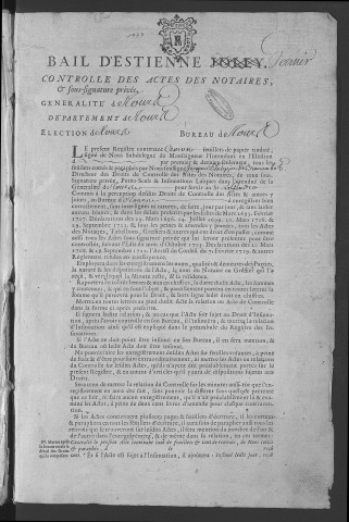 En mars 1693, un édit met en place l'administration du contrôle des actes des notaires. Née de quelques tentatives précédentes et du contexte de crise financière du règne de Louis XIV, cette institution s'est renforcée et développée tout au long du XVIIIe siècle grâce à de nombreux textes. Tous régissent, parfois seulement temporairement, les formalités du contrôle et de l'insinuation (insinuation suivant le tarif et centième denier), ainsi que les formalités secondaires (droits de sceau, d'échange, d'amortissement et franc-fief, etc.). Le fonctionnement de cette institution perdure jusqu'à sa suppression par le décret des 5-19 décembre 1790 appliqué dès le 1er février 1791. Les documents issus de l'ancien contrôle sont alors remis aux directeurs des nouvelles directions de l'enregistrement des départements. Plusieurs ouvrages cités en bibliographie permettront au chercheur d'approfondir le sujet (voir la Bibliographie).