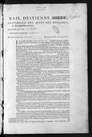 En mars 1693, un édit met en place l'administration du contrôle des actes des notaires. Née de quelques tentatives précédentes et du contexte de crise financière du règne de Louis XIV, cette institution s'est renforcée et développée tout au long du XVIIIe siècle grâce à de nombreux textes. Tous régissent, parfois seulement temporairement, les formalités du contrôle et de l'insinuation (insinuation suivant le tarif et centième denier), ainsi que les formalités secondaires (droits de sceau, d'échange, d'amortissement et franc-fief, etc.). Le fonctionnement de cette institution perdure jusqu'à sa suppression par le décret des 5-19 décembre 1790 appliqué dès le 1er février 1791. Les documents issus de l'ancien contrôle sont alors remis aux directeurs des nouvelles directions de l'enregistrement des départements. Plusieurs ouvrages cités en bibliographie permettront au chercheur d'approfondir le sujet (voir la Bibliographie).