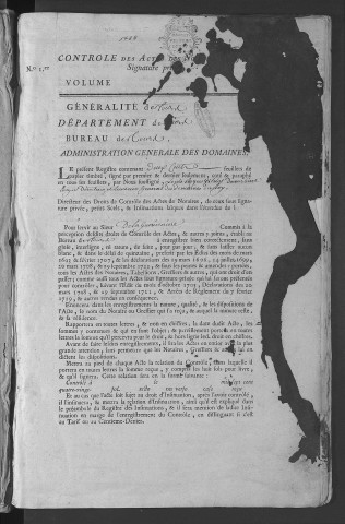 Le fonds contient également deux beaux ensembles illustrant le fonctionnement de l'institution : l'un composé des arrêts du Conseil d'Etat, ordonnances de l'intendant et correspondance relatifs aux droits de franc-fief, centième denier, droits du domaine, droits de contrôle (1767-1789), l'autre de six registres d'enregistrement des textes portant sur les droits de contrôle des actes des notaires et sous signature privée, contrôle des exploits, insinuations laïques et centième denier, petits scels des actes judiciaires, rôle des tailles et autres impositions (1539-1762). Le chercheur pourra s'y référer en consultant le contenu des sources complémentaires.