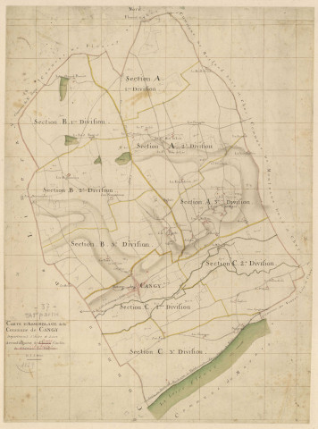 T.A., A1 à A3, B1 à B3, C1 à C3, D1 à D2, E1 à E2. Le plan cadastral de Cangey comprend 2 T.A. : le premier correspond à la commune de Cangey, le second à l'ancienne commune de Fleuray, réunie à Cangey par ordonnance royale du 2 octobre 1822. Les sections D et E correspondent à l'ancienne commune de Fleuray.