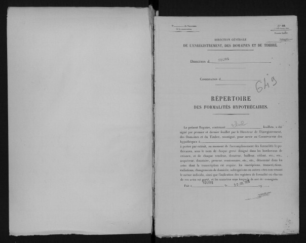 (4 Q 5/1016-1018). Puis commence la longue série des inscriptions numérotée à partir du numéro 1. Notons que le premier volume numéroté 1 est en déficit au moment de la rédaction du répertoire de la sous-série 4 Q. Il devait couvrir la période du 3 nivôse an IV au 26 brumaire an VII, comme l'indique l'inventaire des registres de la conservation de Tours conservé sous la cote 4 Q 5/1.
