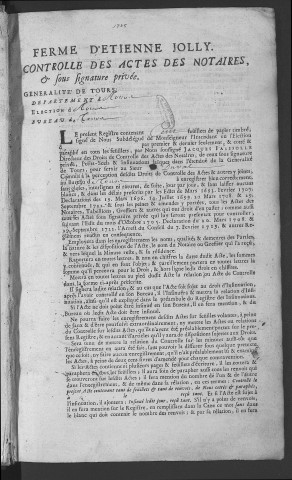 Le fonds de l'intendance de la généralité de Tours, conservé dans la série C des Archives départementales d'Indre-et-Loire, constitue un immense ensemble, classé au XIXe siècle. Les archives de la ferme des domaines et des formalités du contrôle des actes, insinuation et centième denier se composent de dossiers et registres, d'importance inégale. Les premiers, formés de pièces de procédure, sont peu volumineux et issus de la compétence des intendants en matière de connaissance de toutes les contestations entre fermiers des domaines, officiers publics ou particuliers débiteurs de droits, relatives au contrôle des actes, petit scel et insinuation. L'arrêt du 6 mai 1698 décide que les contraventions faites en la régie et perception des droits de contrôle seront instruites et jugées sommairement par les commissaires départis dans les provinces et généralités. Entre 1704 et 1706, les Trésoriers de France connaissent les affaires en première instance, mais à la suite de la déclaration royale du 14 septembre 1706, ce rôle est de nouveau confié aux intendants.