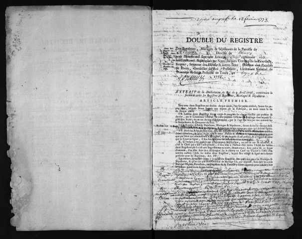 Collection du greffe. Baptêmes, mariages, sépultures, 1772