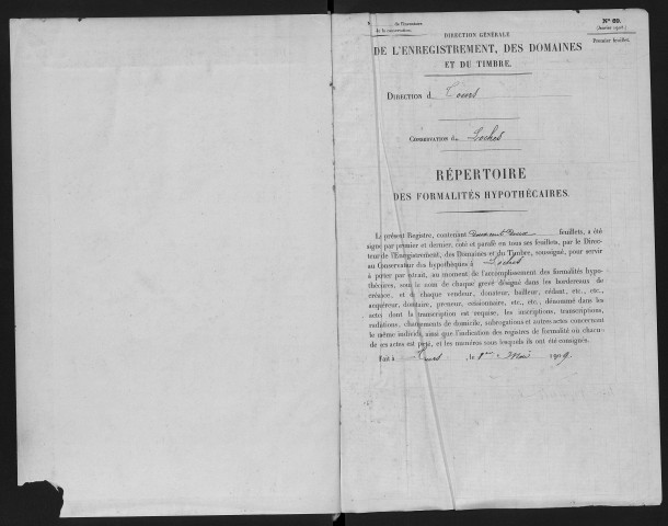 À Loches, les registres d'inscriptions et de transcriptions, jusqu'en 1921, ne sont pas strictement chronologiques pour les mêmes raisons que dans les autres conservations, à savoir l'ouverture et la tenue de plusieurs registres en même temps. Notons toutefois que pour les registres de transcriptions, la conservation des hypothèques de Loches, en 1921, a repris la numérotation d'origine au numéro 1. On a donc deux séries de registres de transcription, une série numérotée de 1 à 2096, qui couvre la période de l'an VII à 1921, et une autre série numérotée de 1 à 798 qui va de 1921 à 1955.