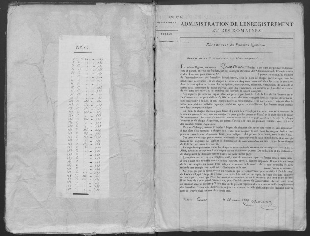 (4 Q 5/1016-1018). Puis commence la longue série des inscriptions numérotée à partir du numéro 1. Notons que le premier volume numéroté 1 est en déficit au moment de la rédaction du répertoire de la sous-série 4 Q. Il devait couvrir la période du 3 nivôse an IV au 26 brumaire an VII, comme l'indique l'inventaire des registres de la conservation de Tours conservé sous la cote 4 Q 5/1.