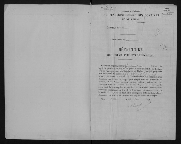(4 Q 5/1016-1018). Puis commence la longue série des inscriptions numérotée à partir du numéro 1. Notons que le premier volume numéroté 1 est en déficit au moment de la rédaction du répertoire de la sous-série 4 Q. Il devait couvrir la période du 3 nivôse an IV au 26 brumaire an VII, comme l'indique l'inventaire des registres de la conservation de Tours conservé sous la cote 4 Q 5/1.