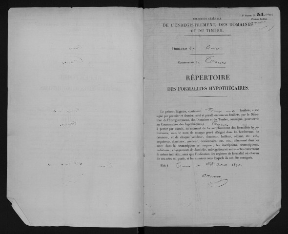 (4 Q 5/1016-1018). Puis commence la longue série des inscriptions numérotée à partir du numéro 1. Notons que le premier volume numéroté 1 est en déficit au moment de la rédaction du répertoire de la sous-série 4 Q. Il devait couvrir la période du 3 nivôse an IV au 26 brumaire an VII, comme l'indique l'inventaire des registres de la conservation de Tours conservé sous la cote 4 Q 5/1.