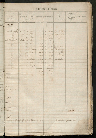 Registre présentant les augmentations et les diminutions survenues dans les contenances et les revenus portés sur les matrices cadastrales, 1830-1914 ; récapitulation des contenances et des revenus imposables, 1828 ; matrice des propriétés foncières, fol. 1 à 480.
