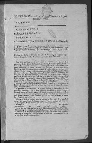 En mars 1693, un édit met en place l'administration du contrôle des actes des notaires. Née de quelques tentatives précédentes et du contexte de crise financière du règne de Louis XIV, cette institution s'est renforcée et développée tout au long du XVIIIe siècle grâce à de nombreux textes. Tous régissent, parfois seulement temporairement, les formalités du contrôle et de l'insinuation (insinuation suivant le tarif et centième denier), ainsi que les formalités secondaires (droits de sceau, d'échange, d'amortissement et franc-fief, etc.). Le fonctionnement de cette institution perdure jusqu'à sa suppression par le décret des 5-19 décembre 1790 appliqué dès le 1er février 1791. Les documents issus de l'ancien contrôle sont alors remis aux directeurs des nouvelles directions de l'enregistrement des départements. Plusieurs ouvrages cités en bibliographie permettront au chercheur d'approfondir le sujet (voir la Bibliographie).
