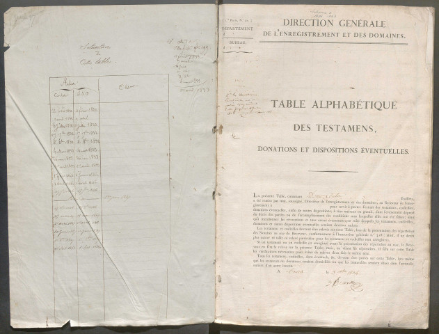 Au 1er janvier 1825 intervinrent encore d'autres mesures concernant d'autres tables : c'est ainsi qu'à compter de cette date là, la nouvelle « table des testaments, donations et dispositions éventuelles » rassembla tous les renseignements contenus précédemment dans les tables des testaments enregistrés, dans celles des testatments non enregistrés et celles des donations et autres dispositions éventuelles. En 1825 également, la « table des successions et absences » remplaça les trois tables des inventaires après décès, des successions acquittées et des sépultures ou décès. Enfin, à partir de cette même date, les partages furent inscrits dans les tables d'acquéreurs, par suite de la suppression des tables de partages et de copartageants.