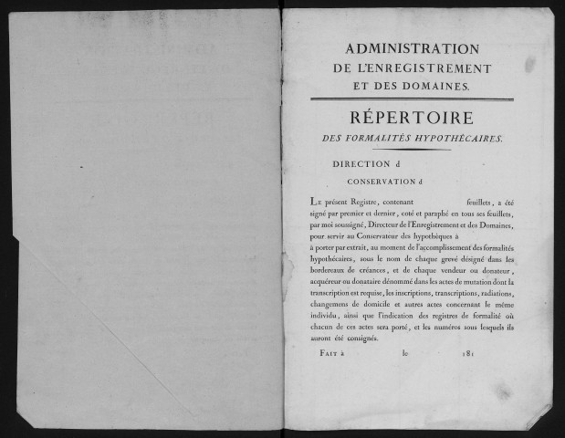 (4 Q 5/1016-1018). Puis commence la longue série des inscriptions numérotée à partir du numéro 1. Notons que le premier volume numéroté 1 est en déficit au moment de la rédaction du répertoire de la sous-série 4 Q. Il devait couvrir la période du 3 nivôse an IV au 26 brumaire an VII, comme l'indique l'inventaire des registres de la conservation de Tours conservé sous la cote 4 Q 5/1.