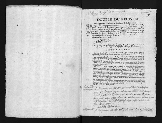 Collection du greffe. Baptêmes, mariages, sépultures, 1783