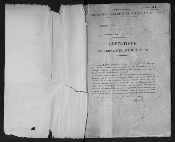 (4 Q 5/1016-1018). Puis commence la longue série des inscriptions numérotée à partir du numéro 1. Notons que le premier volume numéroté 1 est en déficit au moment de la rédaction du répertoire de la sous-série 4 Q. Il devait couvrir la période du 3 nivôse an IV au 26 brumaire an VII, comme l'indique l'inventaire des registres de la conservation de Tours conservé sous la cote 4 Q 5/1.