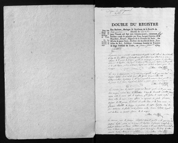 Collection du greffe. Baptêmes, mariages, sépultures, 1764