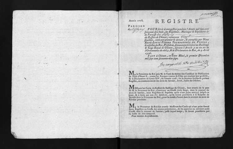 Collection du greffe. Baptêmes, mariages, sépultures, 1778