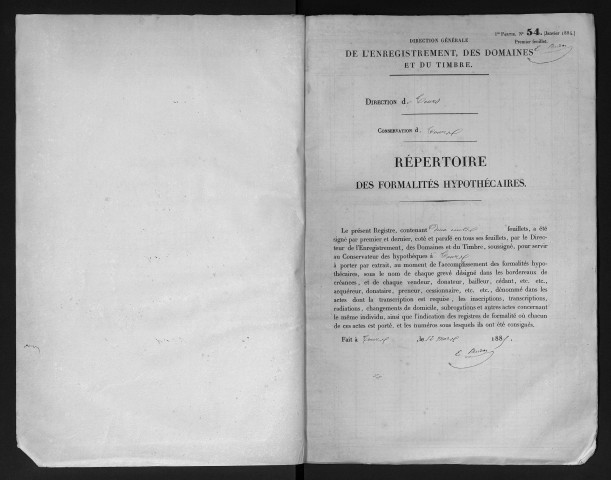 (4 Q 5/1016-1018). Puis commence la longue série des inscriptions numérotée à partir du numéro 1. Notons que le premier volume numéroté 1 est en déficit au moment de la rédaction du répertoire de la sous-série 4 Q. Il devait couvrir la période du 3 nivôse an IV au 26 brumaire an VII, comme l'indique l'inventaire des registres de la conservation de Tours conservé sous la cote 4 Q 5/1.