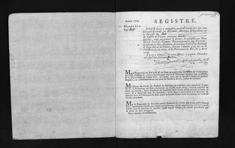 Collection du greffe. Baptêmes, mariages, sépultures, 1779