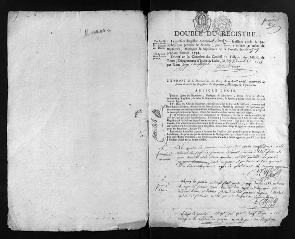 Collection du greffe. Baptêmes, mariages, sépultures, 1792