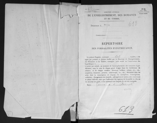 (4 Q 5/1016-1018). Puis commence la longue série des inscriptions numérotée à partir du numéro 1. Notons que le premier volume numéroté 1 est en déficit au moment de la rédaction du répertoire de la sous-série 4 Q. Il devait couvrir la période du 3 nivôse an IV au 26 brumaire an VII, comme l'indique l'inventaire des registres de la conservation de Tours conservé sous la cote 4 Q 5/1.