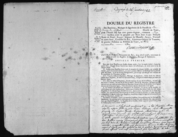 Collection du greffe. Baptêmes, mariages, sépultures, 1781