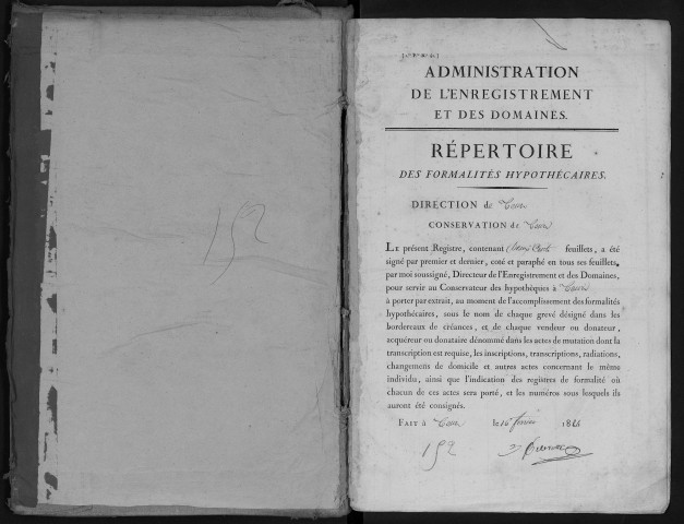 (4 Q 5/1016-1018). Puis commence la longue série des inscriptions numérotée à partir du numéro 1. Notons que le premier volume numéroté 1 est en déficit au moment de la rédaction du répertoire de la sous-série 4 Q. Il devait couvrir la période du 3 nivôse an IV au 26 brumaire an VII, comme l'indique l'inventaire des registres de la conservation de Tours conservé sous la cote 4 Q 5/1.