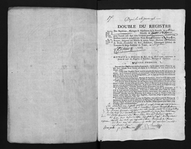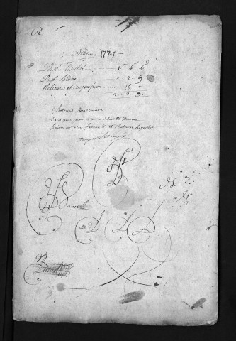 Collection du greffe. Baptêmes, mariages, sépultures, 1774-1775