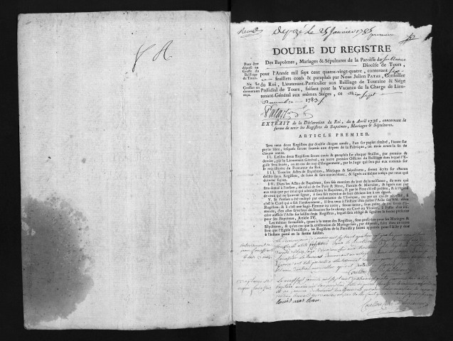 Collection du greffe. Baptêmes, mariages, sépultures, 1784