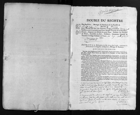 Collection du greffe. Baptêmes, mariages, sépultures, 1772