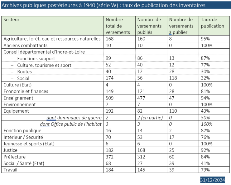 Tableau du taux de publication des instruments de recherche des versements postérieurs à 1940 (série W)