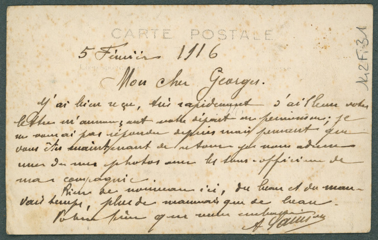 Anonyme, Alexandre Sainson parmi les soldats de son régiment, tirage au gélatino-bromure d’argent sur papier carte postale, février 1916 (142Fi31)